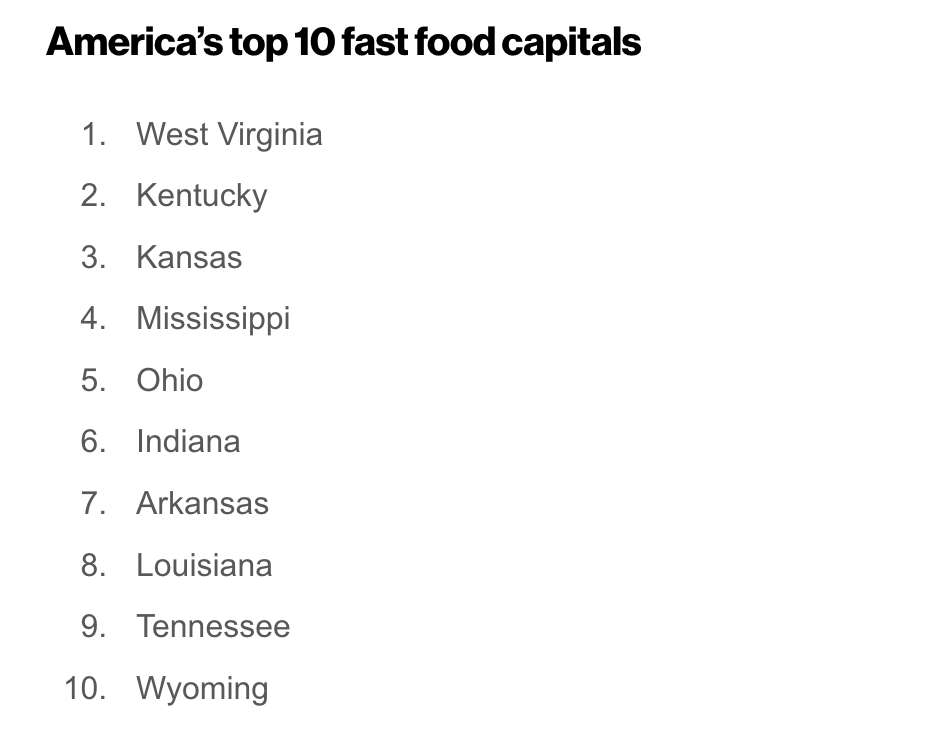 CDC(美国疾病控制与预防中心)的数据表明,西弗吉尼亚、密西西比和阿肯色这几个快餐密集州,同时也是全美肥胖率最高的前三,超过 40%。(好吃是好吃,就是长肉啊