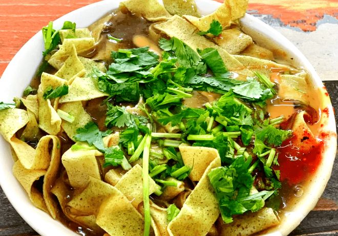 在天津,叫醒清晨的不是闹钟,是巷口锅巴菜的卤香。这小吃看着像 “菜”,其实是用锅巴做的:锅巴得用小米面烙,烙得薄而脆,切成菱形块;卤汁要提前熬,筒骨、老鸡丢进锅,加酱油、八角、桂皮慢炖到汤色酱红,早上把锅巴放进卤汁里煮 2 分钟,让锅巴吸满卤香,再撒上香菜、辣油和少许腐乳汁,一碗锅巴菜就成了。