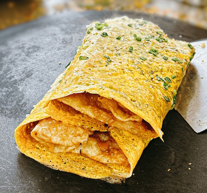 天津的煎饼果子,和别处的完全不一样 —— 老天津人说 “煎饼果子的魂在绿豆面和现炸馃子”,少一样都没那味。摊煎饼时,师傅舀一勺绿豆浆倒在鏊子上,用竹蜻蜓快速摊成薄饼,打个鸡蛋抹匀,撒上葱花和芝麻,翻个面,放上刚炸好的馃子,抹上甜面酱、腐乳汁和少许辣油,卷起来递到手边。咬一口,饼软乎乎的,馃子脆得 “咔嚓” 响,酱料咸甜适中,多一分齁,少一分淡,不少游客吃了都说 “比别处的煎饼香十倍”。